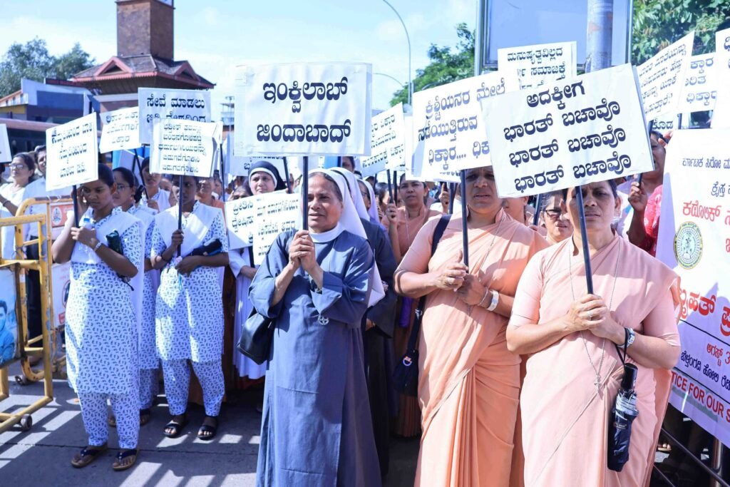 Mangaluru, India – A wave of solidarity swept through Mangaluru on Monday, as hundreds of faith-based citizens, social activists, and religious leaders gathered outside the Mini Vidhana Soudha. Organized by the Catholic Sabha Mangalore Pradesh, this peaceful protest was a powerful demand for justice for two Catholic nuns and a tribal youth who were recently arrested in Chhattisgarh under questionable circumstances.